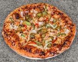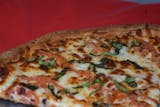 Pizza sauce, chicken, mozzarella, topped with pico-de-gallo.